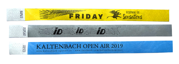 Mit unseren vielseitigen Tyvek Einlassbändern können Sie sicherstellen, dass nur autorisierte Personen Zutritt zu Ihrer Veranstaltung haben. Der kräftige perforierte Klebeverschluß sorgt dafür, dass die Armbänder nicht wiederverwendet oder ohne sichtbare Schäden entfernt werden. Tyvek besteht aus Polyethylenfasern und ist zu 100% recycelbar, was es zu einer relativ umweltfreundlichen Option im Vergleich zu anderen Materialien wie Plastik oder Vinyl macht.